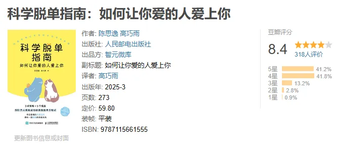 本书结合了心理学理论与真实案例,为你提供了一套行之有效的系统脱单方法论。从吸引力法则到社交策略,从初次约会技巧到长久关系维护,心理学博士手把手教你如何找到对的人。通过实践书中的方法,你一定能快速脱单、高效恋爱,并维持一段稳定、长期、健康的关系。