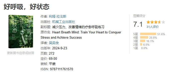 本书作者是生理心理学方面的专家,主要研究压力下人的表现相关课题。本书中,她指导读者进行10周循序渐进的呼吸训练,改变心率变异性(良好的心率变异性让人可以更好控制心脏在压力下的反应和恢复程度),达到在运动比赛、演讲、会议发言等场合的良好表现。