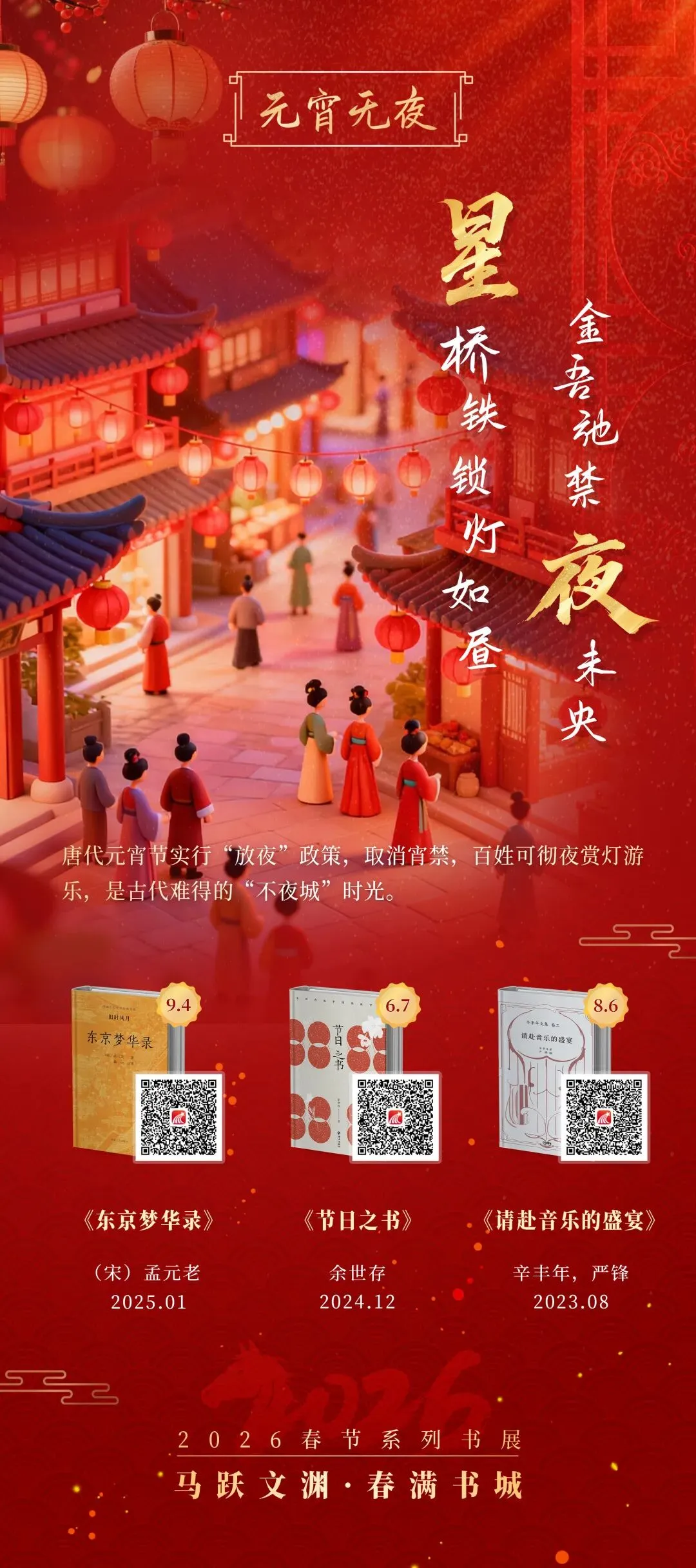 本书展以元宵楹联为媒,自古文典籍中精选十副对联,串联起赏花灯、观社火、走百病、诉情意、庆丰收等元宵古俗,配以《东京梦华录》的市井繁华、《团圆记》的温情守望、《好的爱情》的现代哲思……共同勾勒出一幅既古朴又灵动的元宵图景。