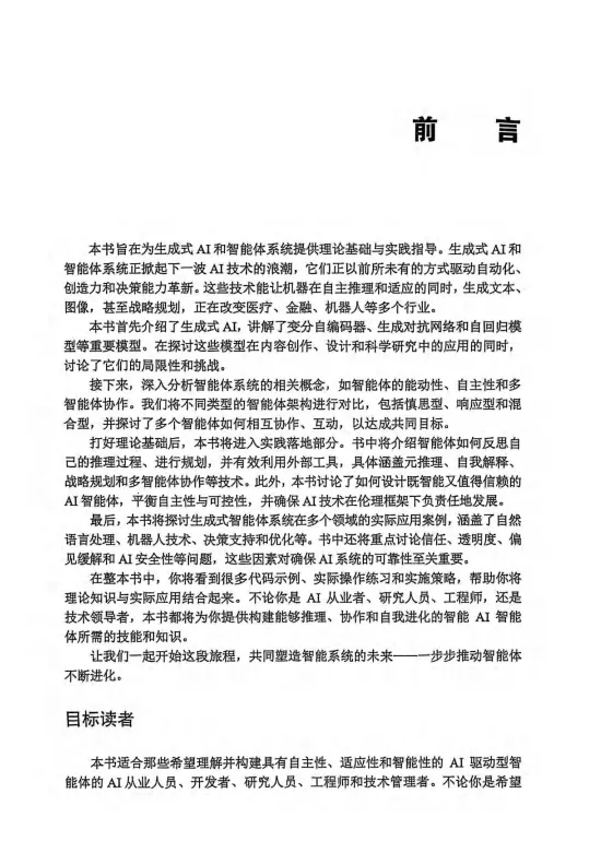 本书核心优势在于 “理论体系 + 工程落地” 双突破:从智能体推理、规划、自适应的核心原理,到多智能体协作、工具调用、RAG 增强等关键技术,再到可信保障、伦理安全的工程化设计,层层递进搭建完整知识框架。融入汽车供应链测试、企业工作流自动化等真实产业案例,详解 CrewAI、LangGraph 等主流框架实操,摒弃晦涩理论,让复杂架构设计变得易懂可落地。