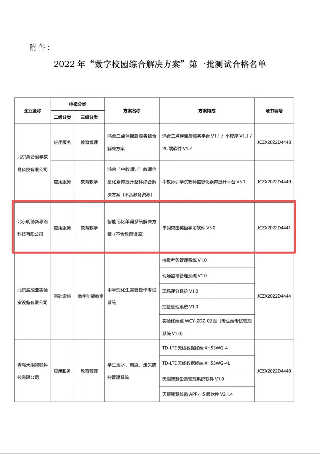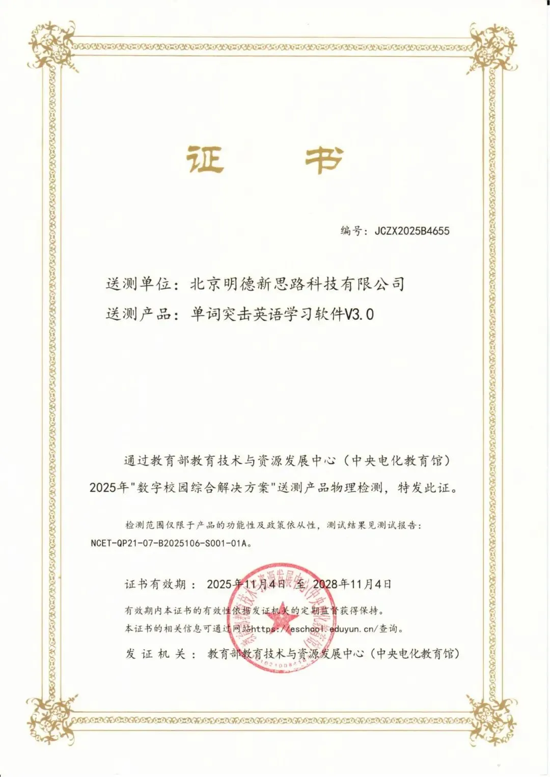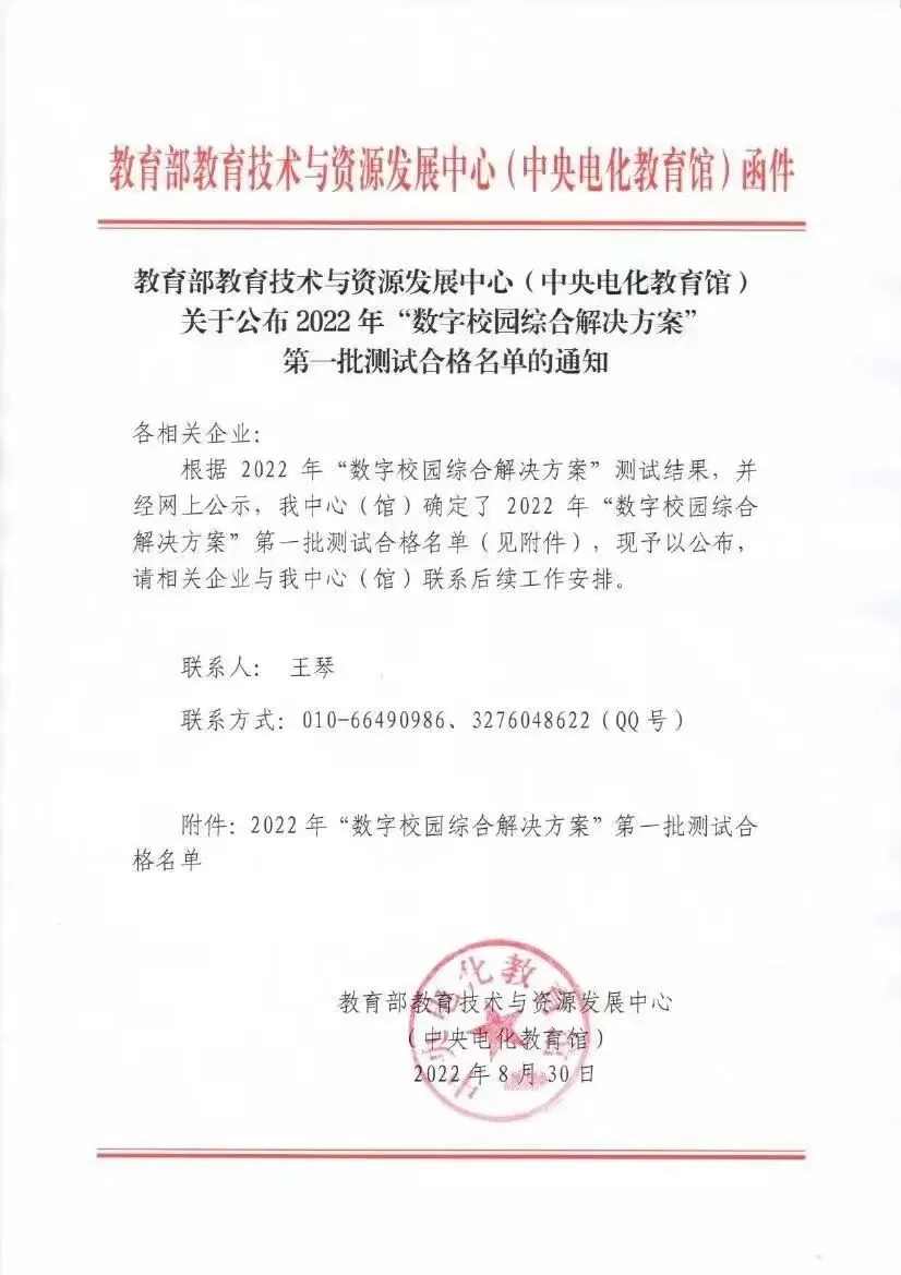 该产品同时顺利通过教育部教育技术与资源发展中心(中央电化教育馆)的专业严格测评,成功入选 “数字校园综合解决方案” 测试合格名单,成为教育部首批认证的智慧校园官方推荐产品!