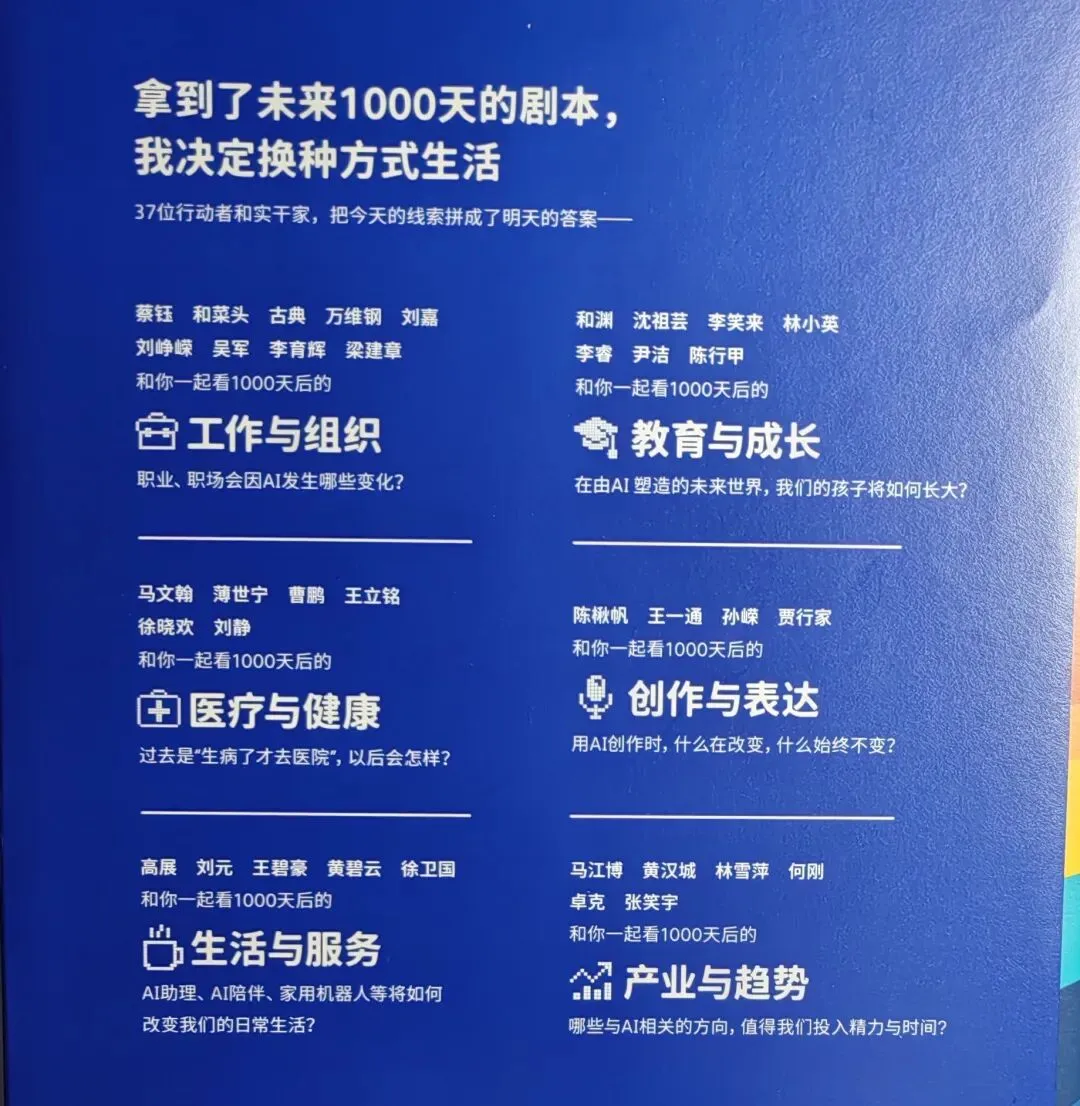 这本书由37位行动者和实干家共同创作,聚焦未来1000天的世界变化,从工作与组织、教育与成长、医疗健康、创作表达、生活服务、产业与趋势等多个维度,展现了世界产业正在由原来“垂直”单线模式向“扁平”多元组合发展。是让人感到好奇和值得期待的一本书。