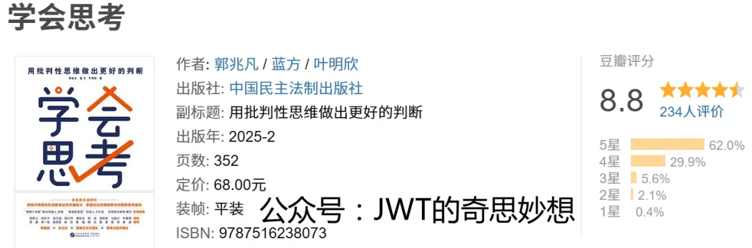 《学会思考》由郭兆凡、蓝方、叶明欣合著,中国民主法制出版社出版,是一本聚焦批判性思维的实用指南。全书旨在帮助读者建立理性思考的能力,在面对复杂信息与多元观点时,能够辨别真伪、权衡利弊,从而做出更明智的判断。作者结合现实生活中的典型案例,从逻辑谬误识别、证据评估、因果推断等多个维度展开讲解,既涵盖思维训练的方法论,也提供可操作的实践路径。书中语言通俗易懂,结构清晰,适合希望提升独立思考能力的学生、职场人及对思辨感兴趣的普通读者。它不仅教人“怎么想”,更引导人“如何不被误导”,在信息爆炸与情绪主导的时代,为读者提供一套清醒思考的工具箱,助力于个人成长、公共讨论与理性决策。