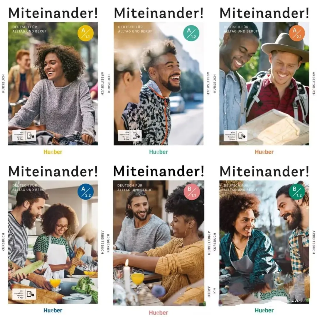 教材名称 "Miteinander!" 在德语中意为“在一起!”或“相互合作!”,强调互动、交流以及在实际情境中运用德语的能力。学习内容紧密结合日常生活情境,比如找房子、工作、朋友聚会等等。不仅仅是学语法,