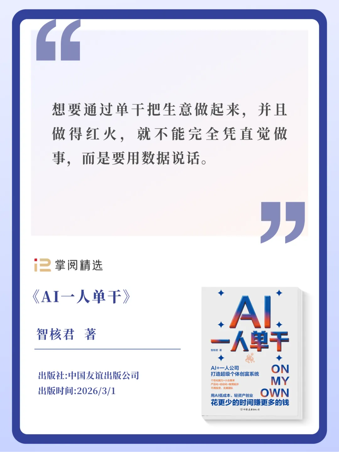 当“单干”成为可能,如何把自己活成一家公司?这正是《AI一人单干》探讨的核心:用经营者思维重构自己,借助技术杠杆,从“执行者”变为“经营者”。在AI时代,读懂趋势,自我迭代,挑战人生更多的可能性。