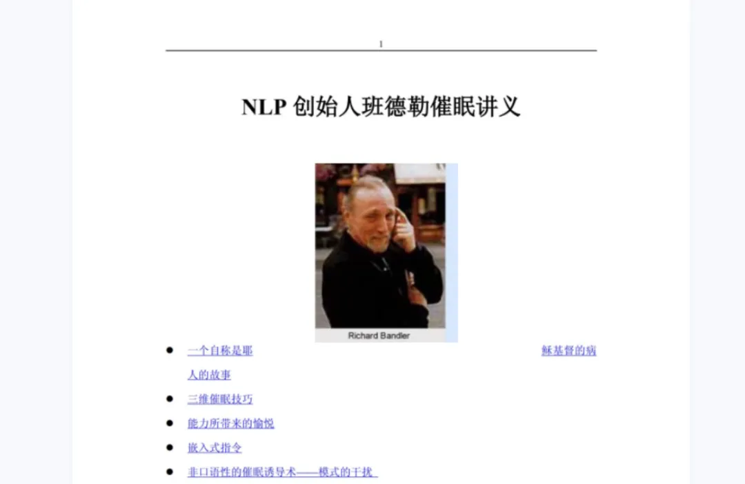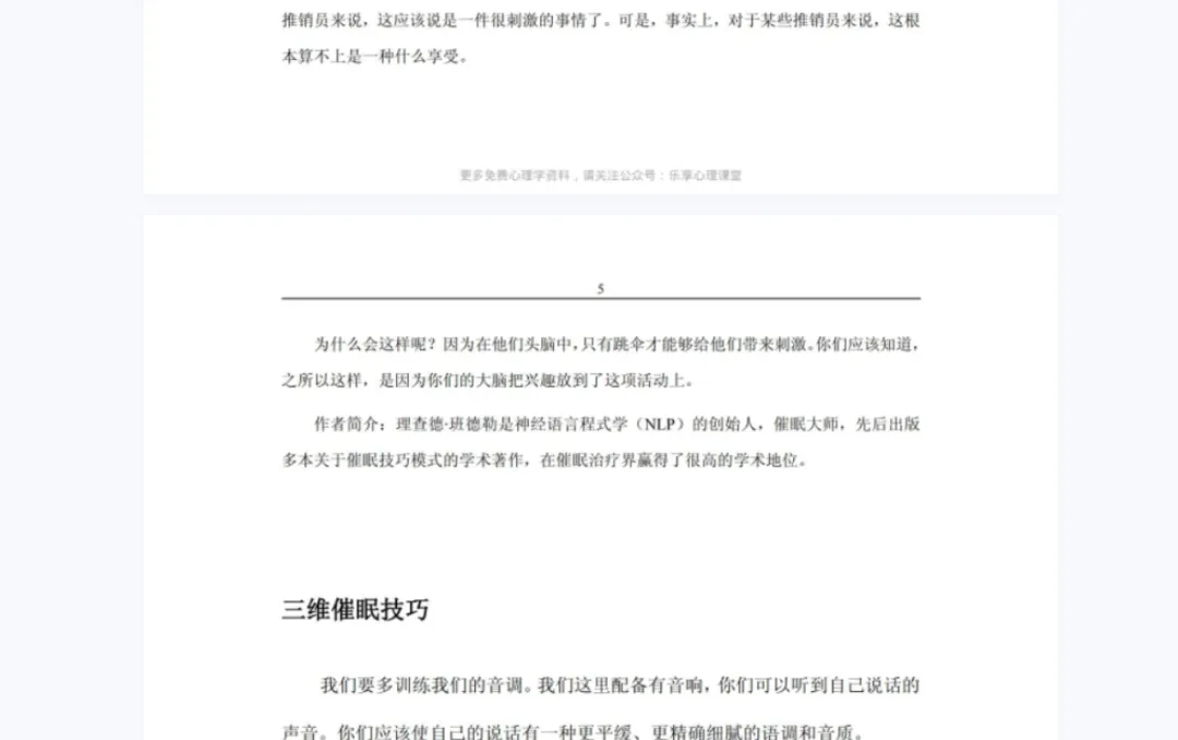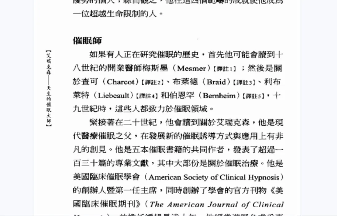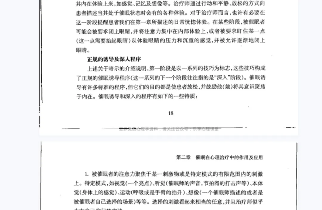 ❀催眠疗法:严重的失眠需要使用催眠技术使患者进入睡眠状态,这是一种很常见的心理治疗方法,用积极的暗示来操控患者的行动,经过正性意念来消除焦虑、恐惧、紧张的情绪,催眠疗法需要多次进行,达到彻底治愈失眠的目的。8. 清醒催眠 催眠话术 文字催眠 NLP全新突破性的报告18. NLP激发潜能系列08-出神入化催眠的最高境界(简体中文版)22. 《经历催眠状态:改变的国家的治疗的通路》(米尔顿-艾瑞克森,欧尼斯特L-罗西)23. 《催眠之声伴随你:催眠咨商大师艾瑞克森故事经典》(米尔顿-艾瑞克森)25. [心理催眠术].(英)迈克尔.赫普.(英)温迪.德雷顿.扫描版28. [读心术-怎样在不为人知的情况下了解和影响他人].(瑞典)亨利克·费克萨斯著30. [催眠]-心灵控制术[(美)马克斯韦尔·马尔茨]32. [超级催眠术.不可思议的灵魂之旅].肖祥银.扫描版33. [艾瑞克森:天生的催眠大师].(美)萨德.扫描版原价99元
