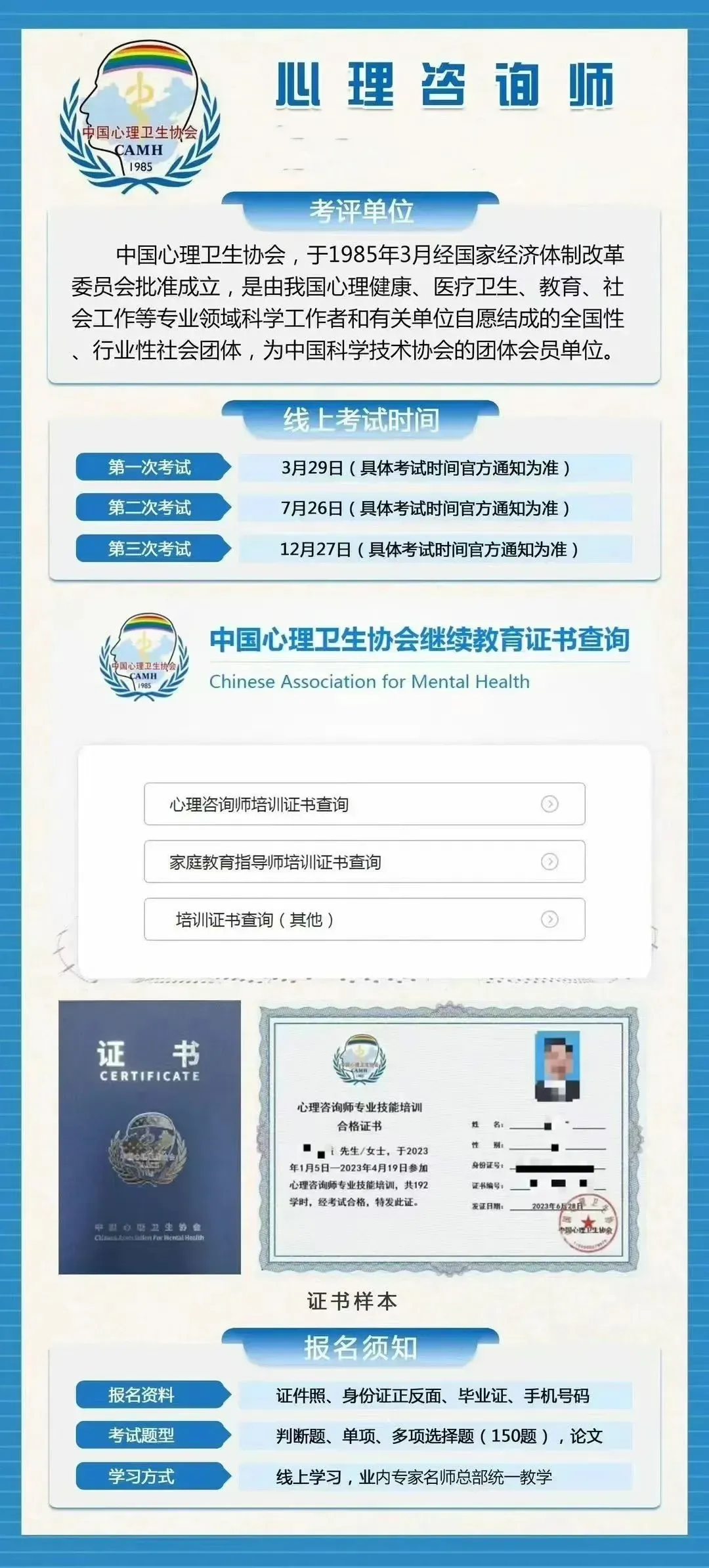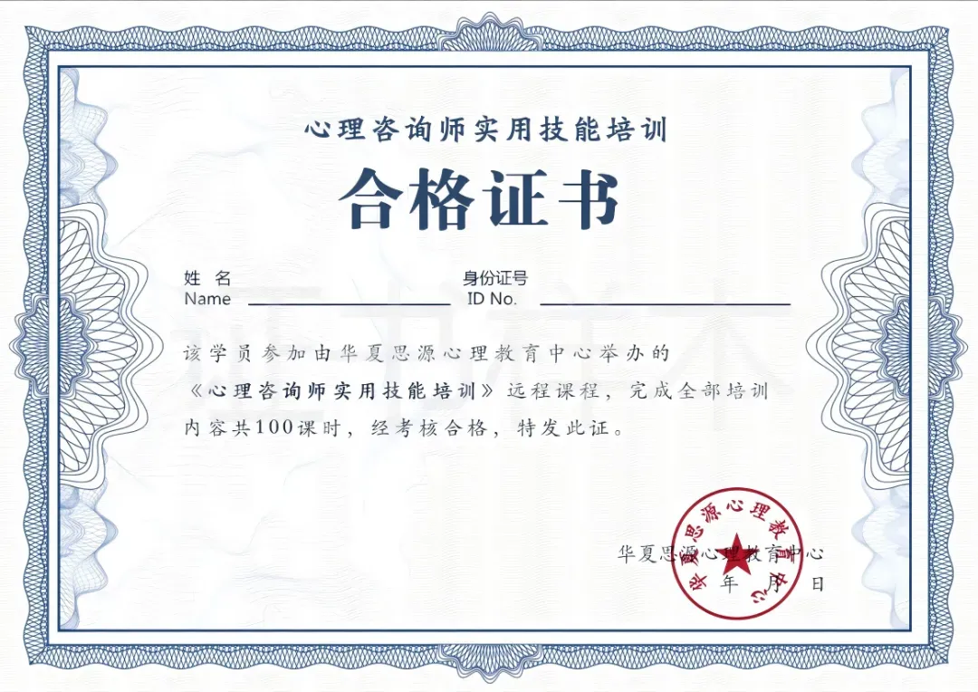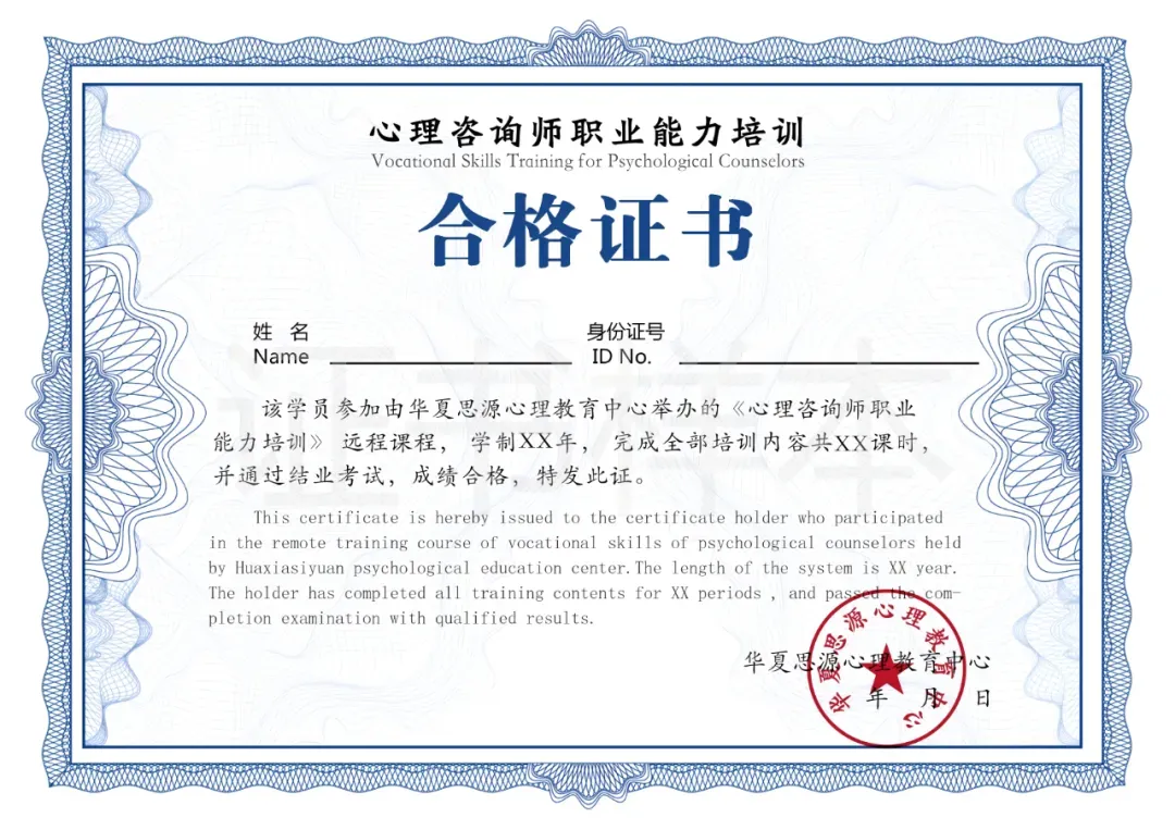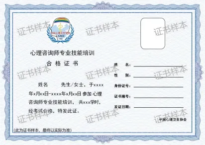 经考核合格,由中国心理卫生协会认证颁发《心理咨询师专业技能培训合格》证书。证书统一编号,由中国心理卫生协会心理咨询职业技能培训项目组指定网址查询培训合格证书。此证书表明持证人已经通过相关课程的培训考核,具备相应的专业知识和职业技能,可作为能力评价、考核、聘用和任职的参考。(证书费680元)