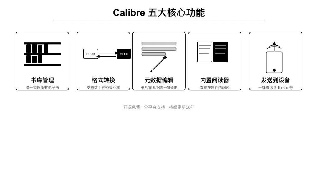 Calibre 五大核心功能Calibre 是一个开源电子书管理软件,Windows / macOS / Linux 全平台支持,完全免费。
