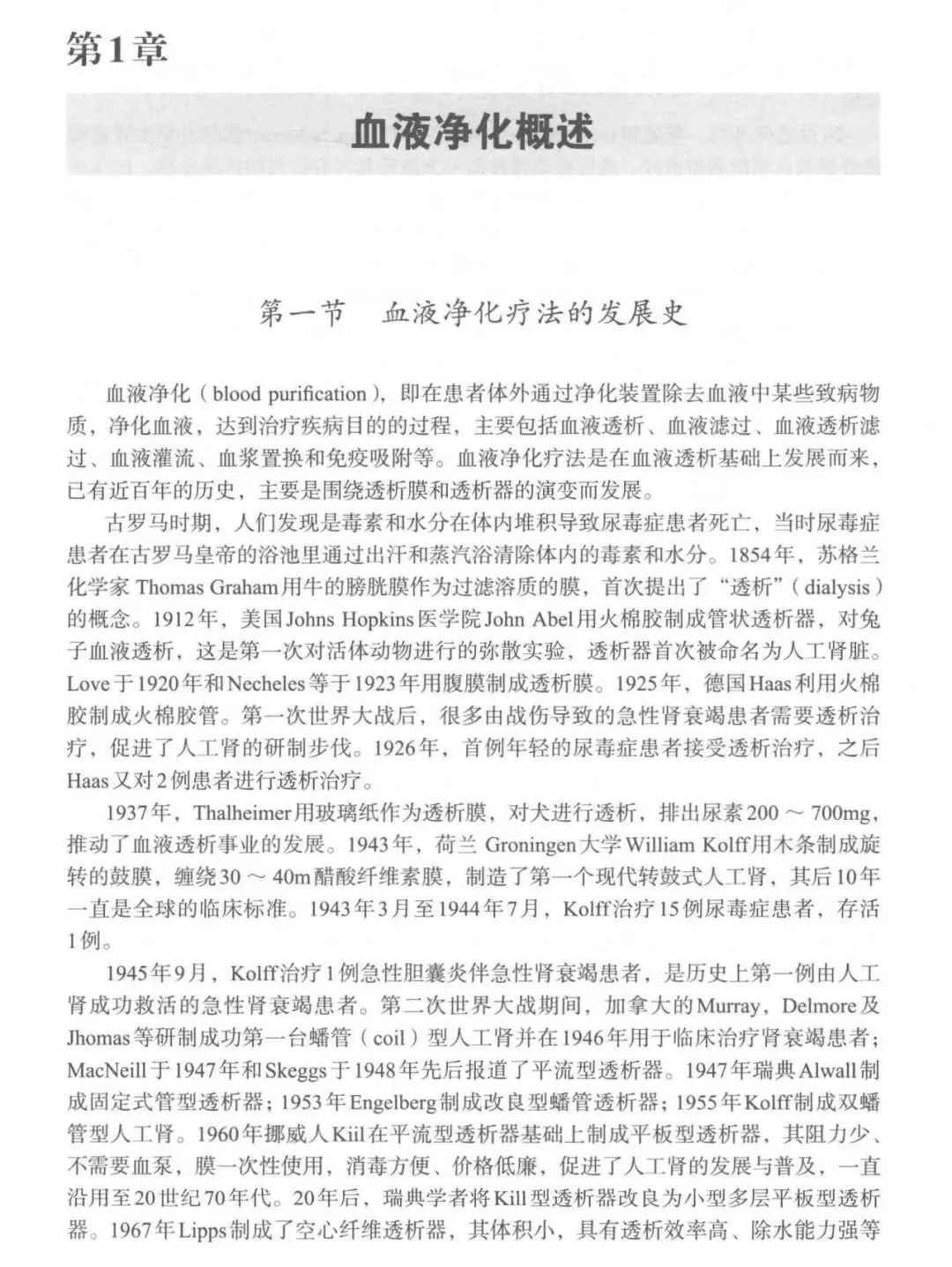 主要内容涵盖血液透析的护理、血管通路的护理、透析并发症的护理、特殊血液净化技术操作护理等,并详细介绍了血液净化感染控制标准、血液净化治疗患者的营养干预、血液净化设备使用标准及维护、透析液及透析用水质量及监测、血液净化质量管理的标准与指南 。每章均包含案例与习题,以增强系统性和实用性。本书适用于血液净化中心护士、肾内科医护人员和血液净化中心管理者第1章 血液净化概述