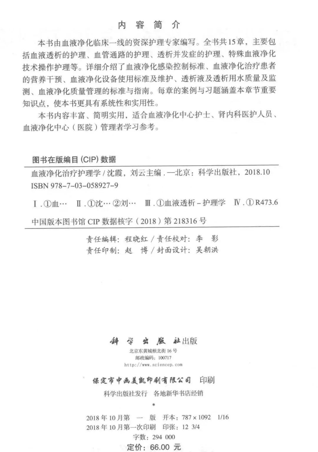 《血液净化治疗护理学》,科学出版社,作者沈霞、刘云,2018年10月出版,共15章,PDF 204页