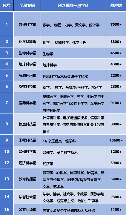 15个学科辑覆盖自然科学、工程与技术科学、人文与社会科学、医药科学、农业科学五大门类的所有一级学科,按中图法和学科领域进行双重分类。