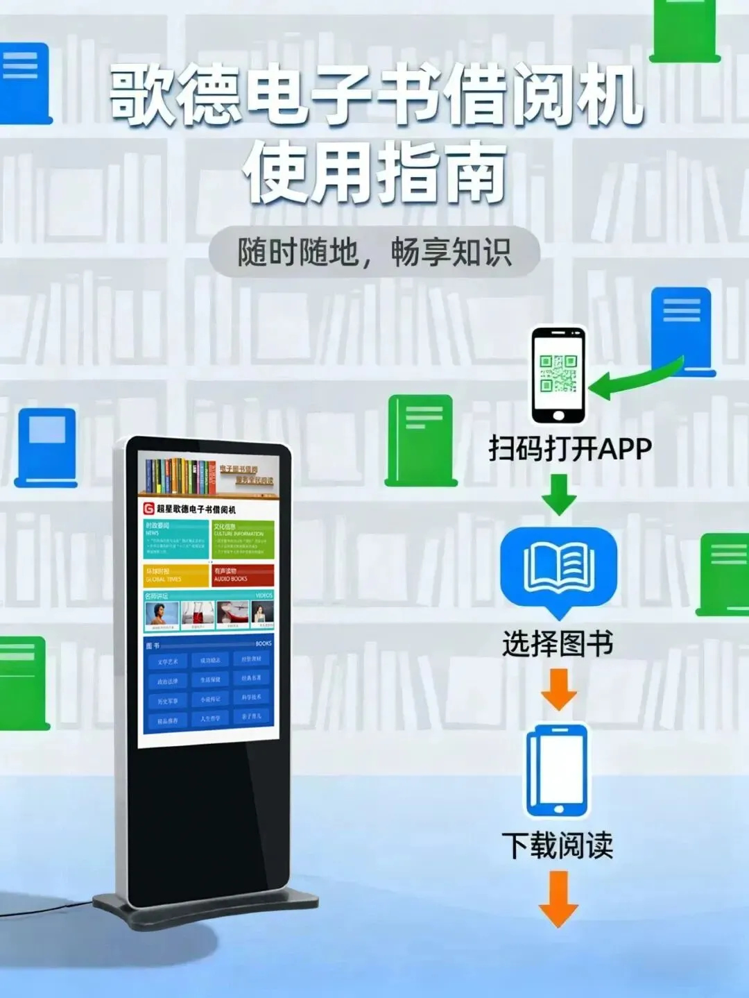 歌德电子借阅机以其独特的自助借阅系统和二维码扫描功能,让读者可以轻松下载并离线阅读超过3000册的正版电子图书。歌德机的设立,旨在为读者提供更加便捷的数字阅读服务。每月更新150册,每年累计更新1800册,涵盖经典名著、生活保健、经管理财、成功励志、小说传记、历史军事、文学艺术等12个类别的优质电子书资源;内置200种正版授权的大众类期刊,按月更新。满足读者对新书的需求。