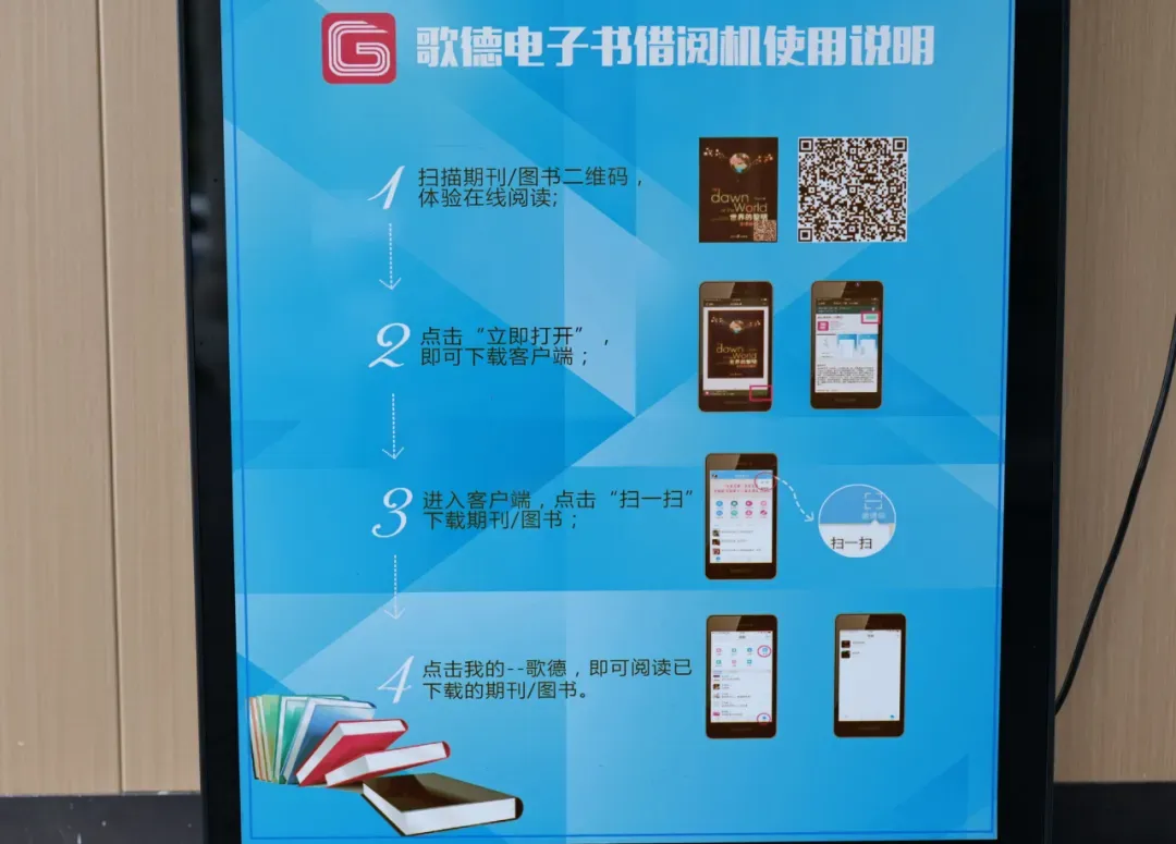使用歌德机非常简单。首先,读者可以直接在机器上点击“在线阅读”,便可以在阅读机上直接阅读图书。其次,读者可以通过微信扫描书刊的二维码,直接在微信上进行阅读,并且通过微信收藏功能保存书籍,方便下次继续阅读。