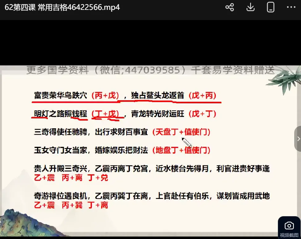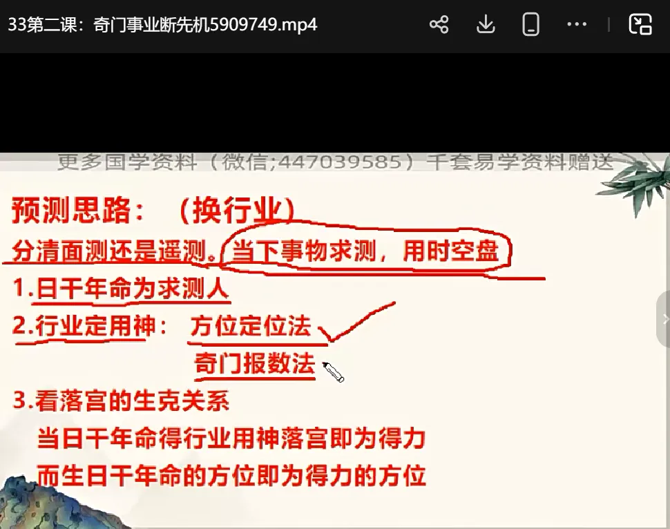 ├──艺臻奇门遁甲培训班70集+阵法电子书10本| ├──奇门化解阵法| | ├──大健康阵.pdf 2.23M| | ├──夫妻和合阵.pdf 1.23M| | ├──奇门八门象意.pdf 376.57kb| | ├──奇门八神.pdf 382.51kb| | ├──奇门化四害.pdf 320.08kb| | ├──奇门九星概说.pdf 301.00kb| | ├──奇门文昌阵.pdf 947.31kb| | ├──巧用天医、生气增强自身运势.pdf 407.88kb| | ├──日月星三奇旺财阵.pdf 142.78kb| | └──太极招财阵.pdf 168.78kb| └──艺臻奇门遁甲秘训班| | ├──01第一课:阴阳五行.mp4 173.08M| | ├──02第二课:天干象意、地支.mp4 149.12M| | ├──03第三课:八神和九星象意.mp4 378.53M| | ├──04第四课:八门象意.mp4 81.13M| | ├──05第五课:取用神.mp4 99.46M| | ├──06第六课:起局、入局、封局.mp4 115.37M| | ├──07第七课:十二长生.mp4 323.85M| | ├──08第一课:奇门砂水与应用.mp4 325.38M| | ├──09第二课:奇门空亡缺角的诊断及处理.mp4 186.25M| | ├──10 第三课:大道奇门之阳宅煞气的诊断.mp4 143.25M| | ├──11第四课:风水阴煞的诊断.mp4 146.05M| | ├──12第五课:物品摆放错位败财败运.mp4 170.20M| | ├──13第六节:奇门风水门、窗、床.mp4 232.22M| | ├──14第七课:奇门负能量物品的诊断.mp4 127.06M| | ├──15第一课:子女性格的诊断.mp4 315.02M| | ├──16第二课:子女学业的诊断.mp4 129.09M| | ├──17第三课:子女择学校.mp4 107.91M| | ├──18第四课:子女考学与录取.mp4 80.47M| | ├──19第五课:子女择业.mp4 138.15M| | ├──20 第六课:子女旺运改势增能.mp4 215.39M| | ├──21第一课:奇门催财篇.mp4 76.96M| | ├──22第二课:买卖求财生意篇.mp4 151.49M| | ├──23第三课:奇门讨债篇.mp4 122.51M| | ├──24第四课:奇门求财方向论.mp4 185.63M| | ├──25第一课:奇门催桃花.mp4 86.47M| | ├──26第二课:奇门识良缘.mp4 141.09M| | ├──27第三课:奇门斩桃花.mp4 264.30M| | ├──28第四课:夫妻促和谐.mp4 180.01M| | ├──29第一课:奇门测名字.mp4 229.76M| | ├──30第二课:奇门择名字.mp4 194.13M| | ├──31第三课:奇门姓名旺运改势与启用.mp4 281.71M| | ├──32第一课:奇门投资决策学.mp4 149.08M| | ├──33第二课:奇门事业断先机.mp4 208.98M| | ├──34第三课:奇门洞察合伙人.mp4 128.87M| | ├──35 第一课:奇门数字来源.mp4 268.69M| | ├──36第二课:奇门数字预测.mp4 324.41M| | ├──37第三课 奇门数字调理法.mp4 315.21M| | ├──38.第一课 奇门诉讼预测.mp4 192.83M| | ├──39.第二课 诉讼择天时择贵人.mp4 88.16M| | ├──40 第三课 司法诉讼结果提前断与调整.mp4 210.53M| | ├──41 第一课 识小人避小人.mp4 276.75M| | ├──42 第二课 交贵人.mp4 176.82M| | ├──43 第三课:奇门懂人心识人性.mp4 123.53M| | ├──44第一课:奇门能量运势认知.mp4 321.66M| | ├──45第二课 奇门改势旺运及能量提升方法.mp4 100.33M| | ├──46第一课 奇门五脏六腑的诊断.mp4 131.21M| | ├──47第二课 奇门各疾病系统的诊断.mp4 204.16M| | ├──48第三课 奇门疾病预测.mp4 240.91M| | ├──49第四课 疾病预防及调理.mp4 158.96M| | ├──50 第一课 手工起局.mp4 432.57M| | ├──51第二课 奇门择吉.mp4 246.02M| | ├──52第三课 择日择时.mp4 370.50M| | ├──53第四课 奇门寻人寻物.mp4 122.88M| | ├──54第一课 奇门穿八字—四柱速断.mp4 629.89M| | ├──55第二课 奇门穿八字人物取用神.mp4 125.36M| | ├──56第三课 八字六亲十神特性.mp4 337.91M| | ├──57第四课 奇门穿八字断大运流年.mp4 355.45M| | ├──58第五课 八字五行六亲开悟.mp4 269.02M| | ├──59第一课 伏吟局.mp4 326.81M| | ├──60 第二课 反吟局.mp4 248.03M| | ├──61第三课 五不遇时、天显时格.mp4 229.28M| | ├──62第四课 常用吉格.mp4 63.43M| | ├──63第五课 常用凶格.mp4 89.13M| | ├──64第一课:奇门翻宫法.mp4 126.25M| | ├──65第二课 奇门转宫法.mp4 405.29M| | ├──66第三课 时间直断.mp4 322.15M| | ├──67第四课 本宫与对宫.mp4 154.58M| | ├──68小六壬.mp4 101.21M| | ├──69一掌经.mp4 180.52M| | └──70奇门心想事成法.mp4 36.08M