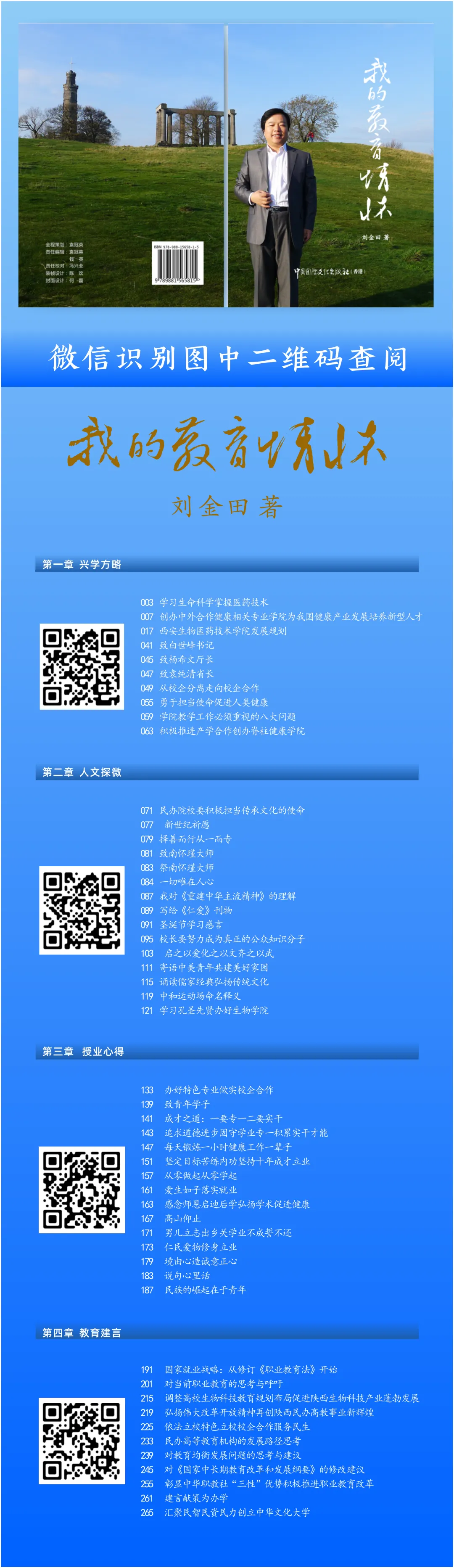 他常常秉笔直书,为国家教育改革创新建言献策;他辛劳奔走海内外,为中国教育雄立世界寻宝取经;他勤于立言著文,为文化中国和和平世界演讲祈福:他随时得缘用心讲学,为公众健康和家庭幸福传播圣贤教导和养生理念,宣传人类健康环保生存方式。