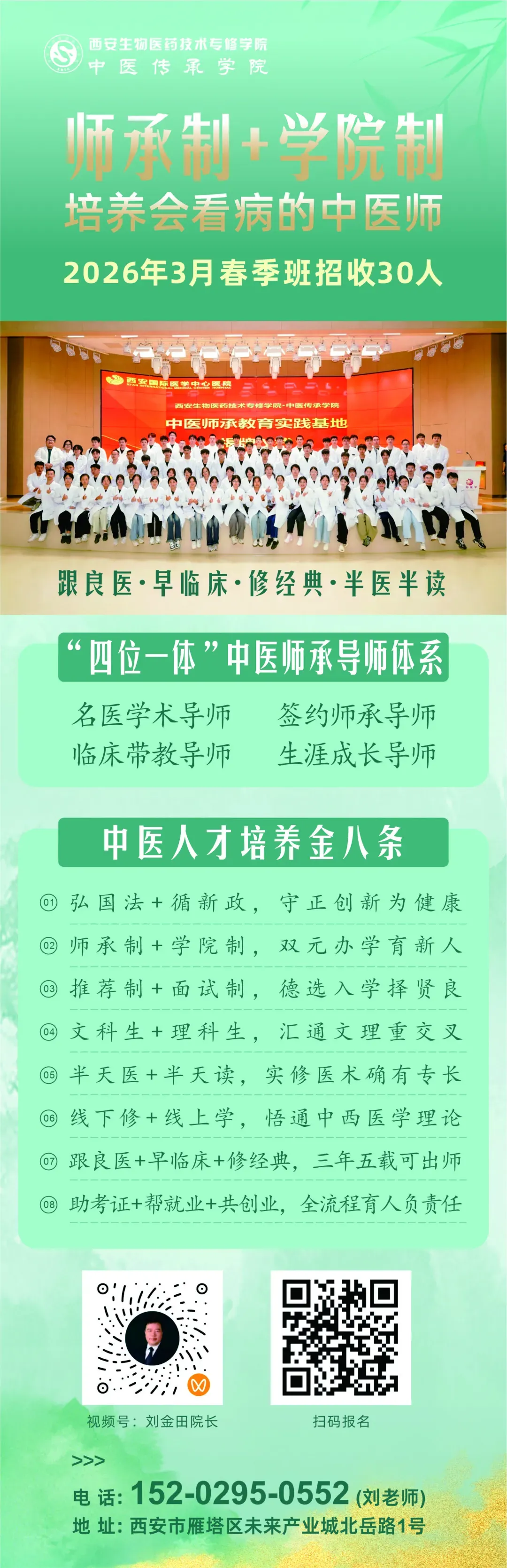 经3-4年系统学习与临床跟诊,学员可掌握中医望闻问切、辨证施治、理法方药、外治技术等,通过省级中医药管理局考核获取《传统医学师承出师证书》和中医助理《医师资格证书》。学院全程提供考证辅导、就业推与创业支持:与陕西中医药大学深化合作,持续搭建中医人才培养与传承大平台,助力中医复兴事业发展。