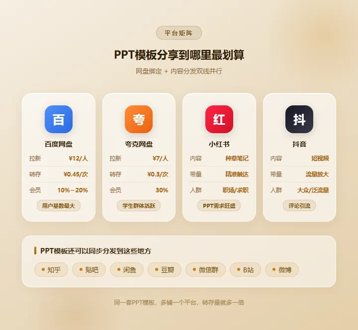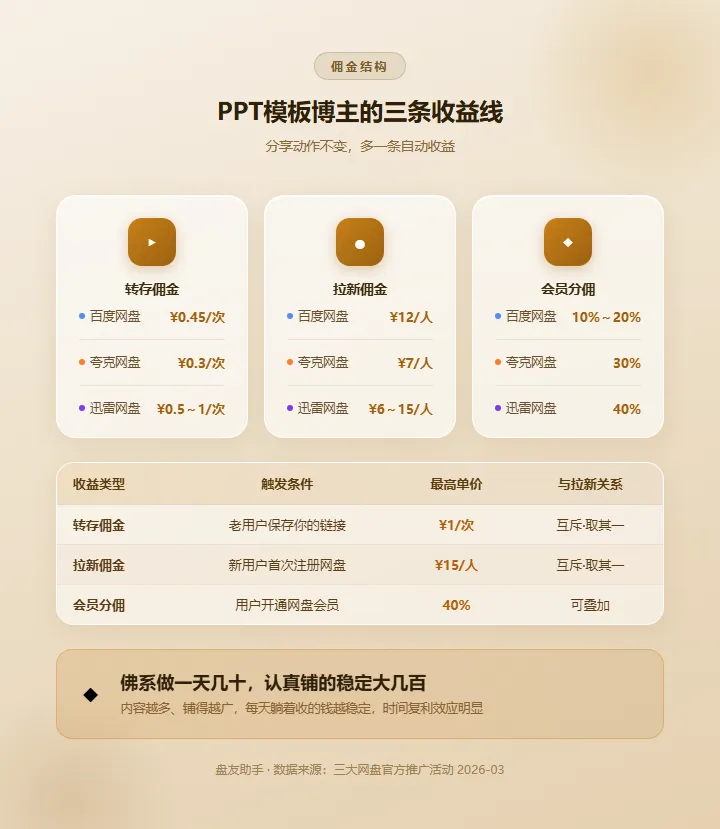 就会触发一次转存佣金——百度网盘每次¥0.45,夸克网盘每次¥0.3,迅雷网盘每次¥0.5~1你发了一个包含30套PPT模板的合集链接,