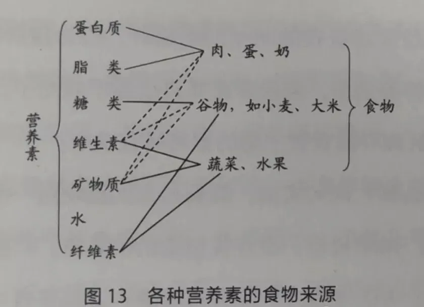 前面说过了,营养素就是参与人体构建的那些东西,包括蛋白质、脂类、糖类、维生素、矿物质、水,其实还应包括氧气和二氧化碳,我们到后面再讨论它。把它们列出来一看就清楚了(图13)。