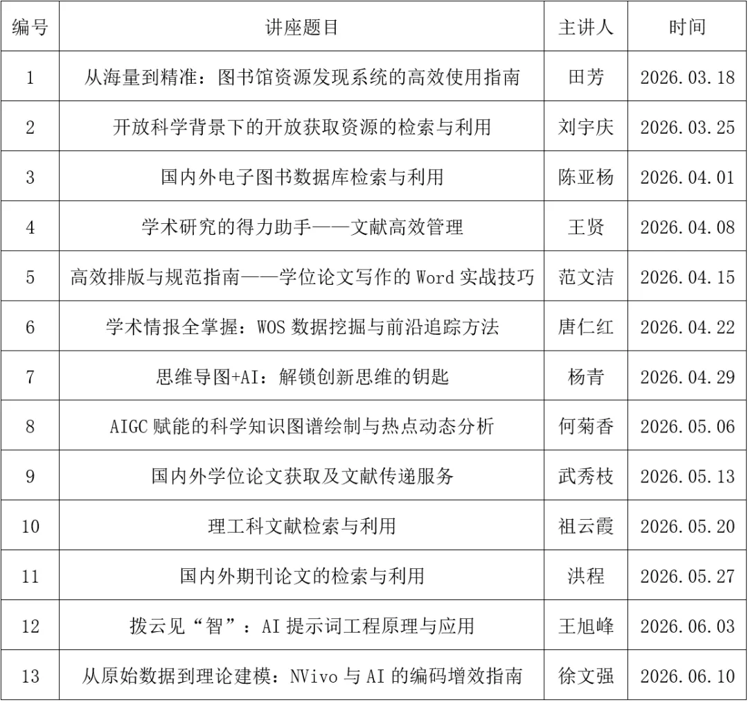 2026年春季,图书馆“智汇科研”系列讲座全新启航,聚焦AI时代的前沿方法与工具,带你学会运用AI提升科研效率,让前沿工具成为你学术探索中的得力助手。