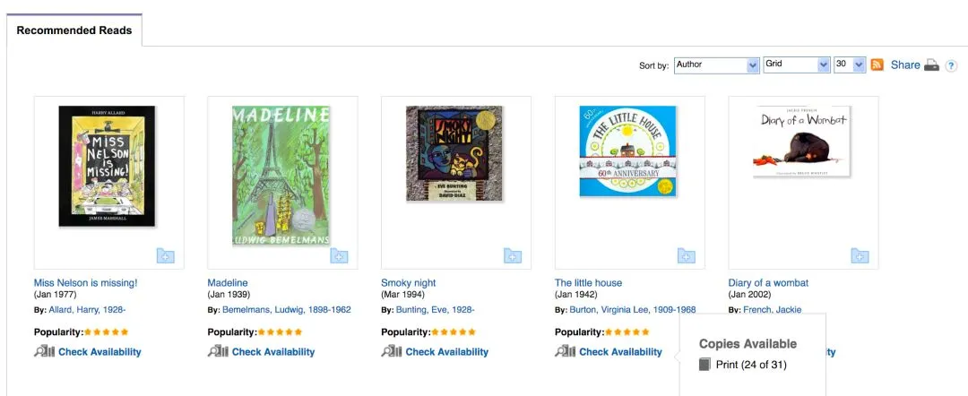 打开一个主题,每本推荐图书下面有个“Check Availability”的链接,点开就可以看到本地图书馆有没有这本书。