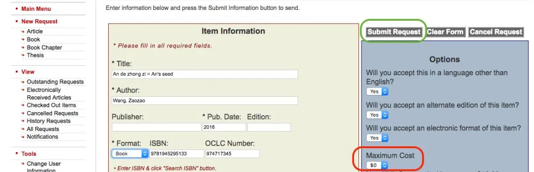 在左边“Item Information”表单里,ISBN和OCLC Number这两项不是必选项,如果不是特地需要某个特别版本的书,就可以把这两项内容删除,另外右边“Options”表单“accept an alternate edition”的选项选成Yes,这样可以提高成功率。
