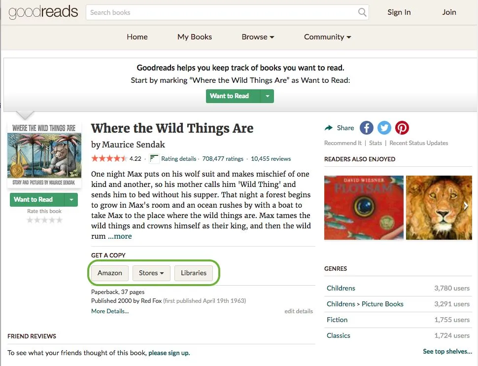 例如搜索Where the Wild Things Are,就可以查看它的相关信息,包括简介,网友评分和讨论。在“GET A COPY” (图中绿框处)有几个按钮,“Libraries”是worldcat.org链接,可以查看图书馆馆藏情况。