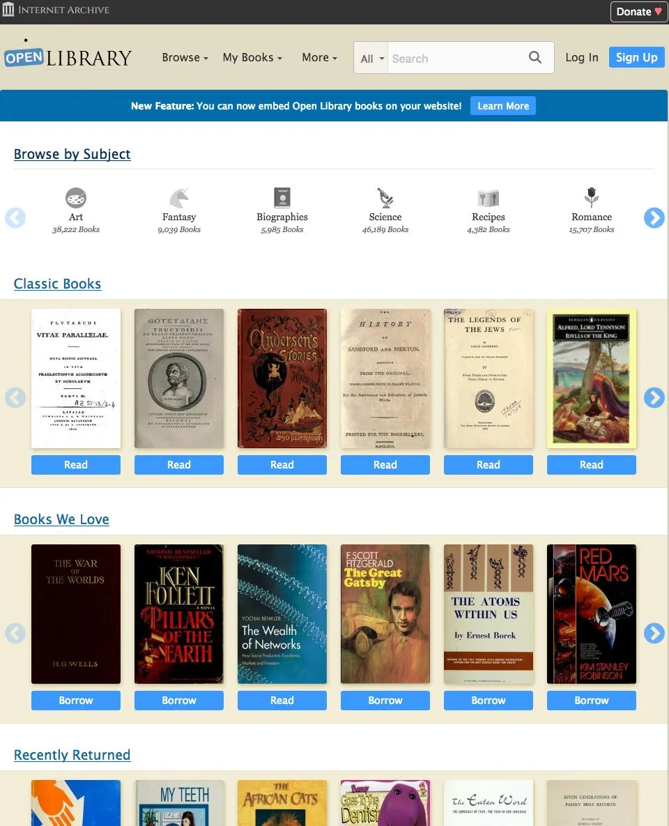这是一个免费的网络图书馆,只提供电子书籍。部分可以直接阅读,不需要账号,比如截图中标为“Read”的书。如果标为“Borrow”,则需要通过账号登录借阅,流程和普通图书馆类似。