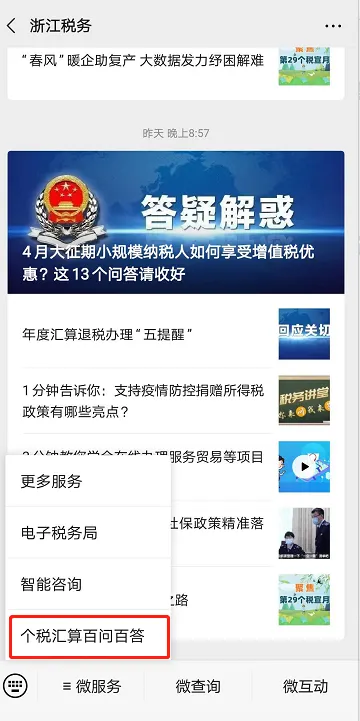 2.您也可以进入浙江税务微信公众号,点击“微服务”——“个税汇算百问百答”查看。