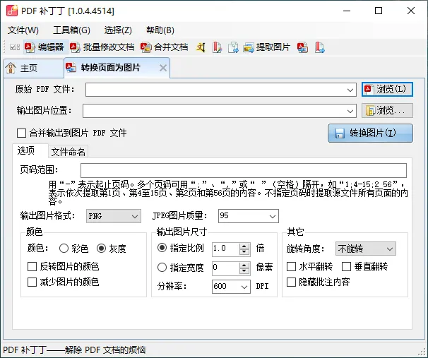 1、用PDF 补丁丁将PDF文件转为图片格式(jpg、png等)涉及到一些参数设置。