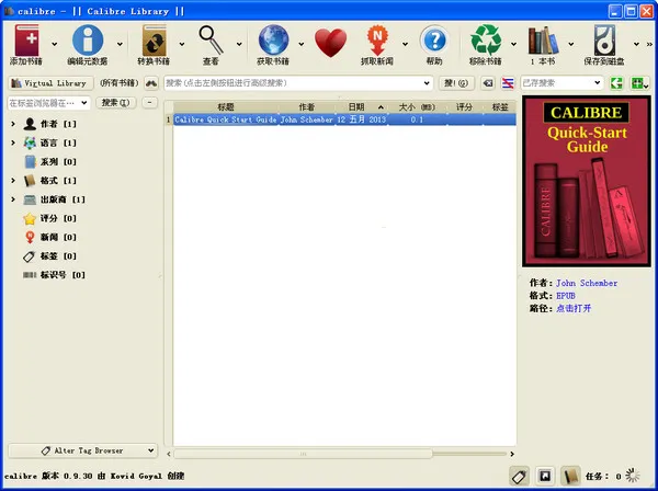 Calibre主界面展示图:Calibre书库界面,左侧为虚拟书架分类,右侧显示详细元数据实测案例: