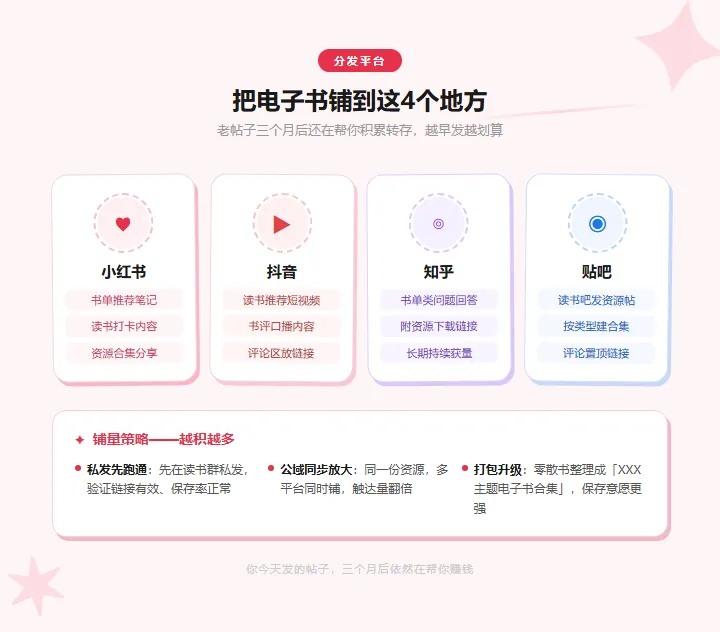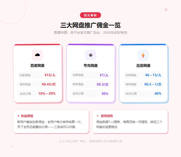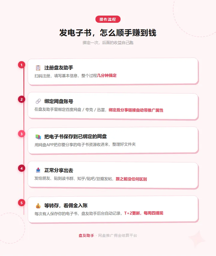 但你不知道的是——这个动作,本来可以让你多赚一笔钱,发生在每一个在群里发电子书、发资料包的普通人身上,百度网盘、夸克网盘、迅雷网盘,每一家平台都有自己的推广计划,逻辑很简单——平台需要用户,用户从哪来,从分享的内容里来,有人通过你分享的电子书链接保存了文件,平台就认为「是你把这个用户引到我这里来的」,如果对方是从没怎么用过这个网盘的新用户,平台付给你一笔「带新用户进来」的佣金,如果对方早就用这个网盘了,每次保存也有一笔「文件转存」的佣金,百度网盘是每次¥0.45,夸克网盘是¥0.3,迅雷网盘是¥0.5~1,注意——这两种收益是互斥的, 同一个人只会触发其中一种,新用户触发带新人收益,老用户触发转存收益,三、 这件事的结构为什么有意思 发电子书是一个边际成本接近于零的行为,你在读书群里发一本电子书,群里有50个人,哪怕只有20个人保存,听起来不多,但 这是你原本就会做的事,只是多了一个收益出口,把「随机发」变成「系统发」——分类整理、发到贴吧、发到知乎、发到小红书,同一份资源可以触达的人数就从50变成500,从500变成5000, 这就是一个内容资产的收益漏斗,今天发的一篇整理帖,三个月后还在被人搜到,还在帮你产生转存收益,是读书群群主,是豆瓣书单博主,是知乎上整理书单的用户,是那些本来就在分享电子书的人——他们只是多绑定了一个账号,多了一条收益线,但当分享行为开始有人买单,性质就变了——这不再是兴趣,这是一门可以被管理的生意,一个有系统的人,和一个随机发文件的人,收益可以差出十倍,区别不在于资源多少,在于 有没有把自己当成一家自我管理的公司来运营,很多人做副业,做着做着变成了「随机收益」——今天发了几个链接,后台有点进账,心情好,这不是一门生意,这是碰运气, 真正的自由,是你有一套可预期的收益结构,你知道自己这周整理了多少份电子书资源,发到了哪几个渠道,覆盖了多少人,你有大概的收益区间——做得佛系的人一天几十,做得认真的人稳定日入大几百,什么书单受欢迎,什么平台触达量更大,什么时候是读书热度的高峰——一个随机发文件的人,永远不会在意, 差距就在这里,平台会自动识别谁通过你的链接保存了文件,佣金T+2更新,每周四可提现, 你不需要改变什么,只是多了一个计费账本,不着急, 先让系统运转起来,你自然会知道下一步是什么,
