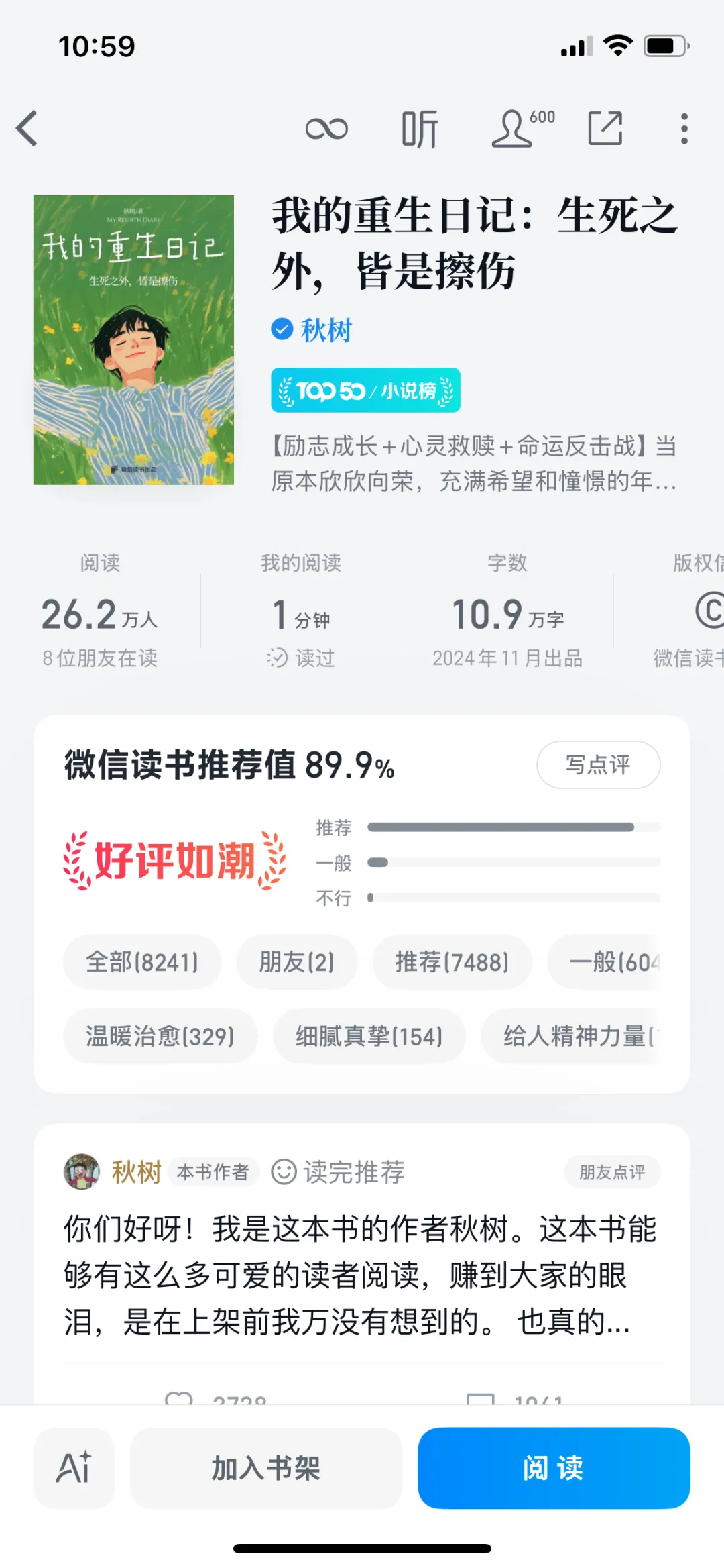 类似的情况同样出现在另一本作品上,《我的重生日记:生死之外,皆是擦伤》我们也是与微信读书率先合作的电子书,自上线以来几乎没下过榜,在飙升榜、新书榜、小说榜、热搜榜、神作榜轮流打转。近期,它的有声版权以高价与一线制作公司达成了合作,并售出了话剧改编权,出版物也即将面世。