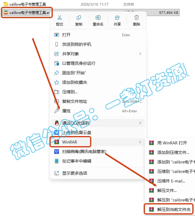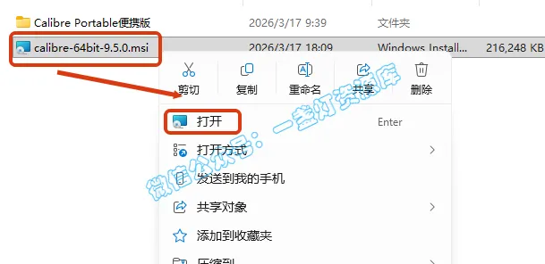 2.打开解压的文件夹,双击进入【win】文件夹,右键【calibre-64bit-9.5.0】选择【打开】
